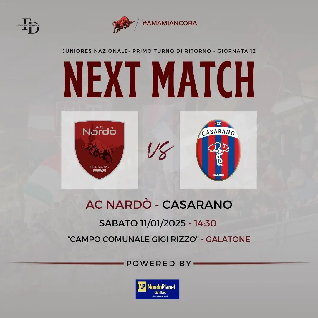 Riprende, dopo la lunga pausa delle festività natalizie, il Campionato Nazionale Under 19. I Torelli di Mr. Daniele Marino saranno impegnati questo pomeriggio, con calcio d'inizio alle ore 14:30, contro i pari età del Casarano, sul campo “Gigi Rizzo” di Galatone.