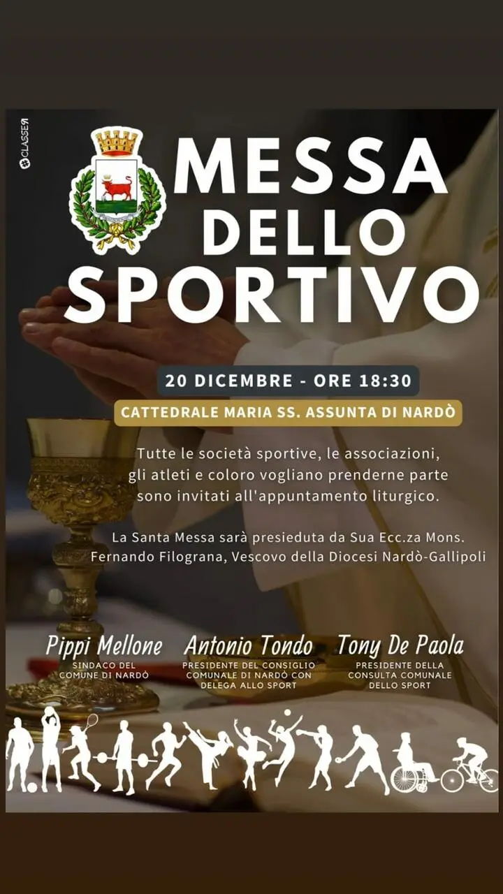 NARDÒ – Un appuntamento di grande significato spirituale e comunitario attende tutti gli sportivi e le associazioni del territorio. Mercoledì 20 dicembre, alle ore 18:30, presso la Cattedrale Maria SS Assunta di Nardò, sarà celebrata la tradizionale Messa dello Sportivo.
