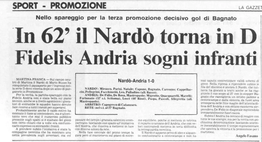 Era il 31 maggio 1981. Chi se lo ricorda? Quanti avranno, pur nell'impossibilità anagrafica, letto di questo spareggio? Giovan Battista Vico sosteneva che alcuni accadimenti si ripetevano con le medesime modalità, anche a distanza di tanto tempo, e ciò avveniva non per puro caso, ma in base ad un preciso disegno stilato della divina provvidenza. Che sia o non sia lo sport é una teoria che trova terreno fertile. Perché gli avvenimenti si ripropongono, e ciò avverrà domani, a distanza di 43 anni. Con un elemento in più di coincidenze, il Martina, città che allora fu sede dello spareggio e che oggi fa da terzo incomodo (insieme al Casarano) nello sguardo puntato sul futuro. Quello spareggio, appartenente ad uno sport di ben altre qualità e valori, ma che continua a chiamarsi calcio, fu deciso da Giuseppe Bagnato, corregionale del nostro Mr Costantino. Quello spareggio "sapeva" di neritinità, non solo perché mosse sulle tribune del Tursi, con un trasporto emotivo senza pari, migliaia di nostri supporters in una gara che garantiva il passaggio in serie D, ma perché nelle fila del TORO vi erano neritini purosangue: Mirarco, Carrozzo, Parisi, Paladino. Era l'esordio in panca di Mario Russo, nonno del nostro Jacopo e futuro allenatore andriese. L'arco di tempo che unisce questi due match ha però allargato la forbice dei valori di questo bellissimo sport. Quella partecipazione che si respirava 43 anni fa dappertutto é oggi un coltello piantato nel fianco della teoria del Vico; quell'orgoglio e quel moto popolare in questi quattro decenni hanno pagato un caro prezzo. Il calcio ora ha un altro volto ed altre qualità. Meno tecnico e più muscolare, di propensione aziendalista, ma soprattutto ha perso tutto ciò che avvolge l'amore, il fascino, l'onore, il mistero e la magia di una parola sola: LA MAGLIA! Facchinetti, Leo, Cappellaccio, un tridente da brividi. Oggi sarebbe sprecato in Lega Pro. Era nello spareggio del 1981, in Promozione! Sono passati ben 43 anni, durante i quali la città ha vissuto alterne fortune calcistiche, con periodi di gloria e momenti di crisi. La "costanza" di questa società merita il supporto del pienone al Giovanni Paolo II. Perché Nardò Andria é una partita ricca di fascino, e non solo per la gloriosa storia calcistica delle due città. Sebbene si tratti di speranze é un peccato non crederci e non esserci. La seduzione della sfera di cuoio ha sempre ammaliato i neritini, per certi aspetti "siamo unici" non solo nel Salento, e non occorre il refrain dell'inno per ricordarcelo. Il fuoco sotto la cenere arde sempre, il background gorgoglia vivace, basta stuzzicarlo. Un'ironica e colorata espressione indigena, che mette in cattedra perseveranza, fiducia e costanza, ma anche una irritante e storica sofferenza, sentenzia così: "ci é veru ca lu mundu gira ti qua a passare". Arriverà quel momento e sarà il giorno del "Vico dei miracoli".