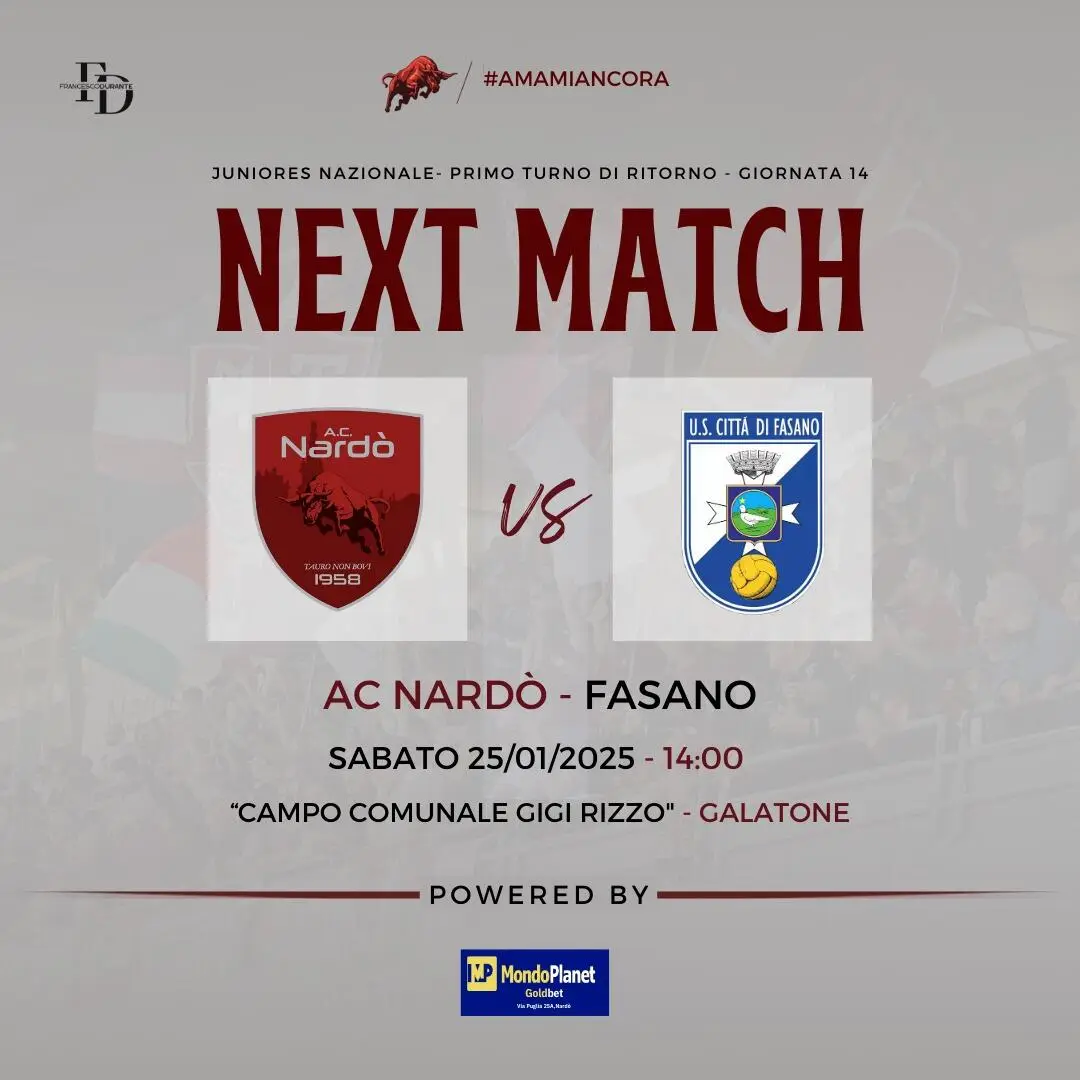 Domani, 25 gennaio 2025, alle ore 14:00, lo stadio comunale "Gigi Rizzo" di Galatone sarà teatro di un incontro, che promette belle emozioni sportive e spettacolo calcistico. La Juniores Nazionale del Nardò, guidata con maestria da mister Daniele Marino, si prepara ad affrontare la formazione del Fasano, attuale capolista del Girone.