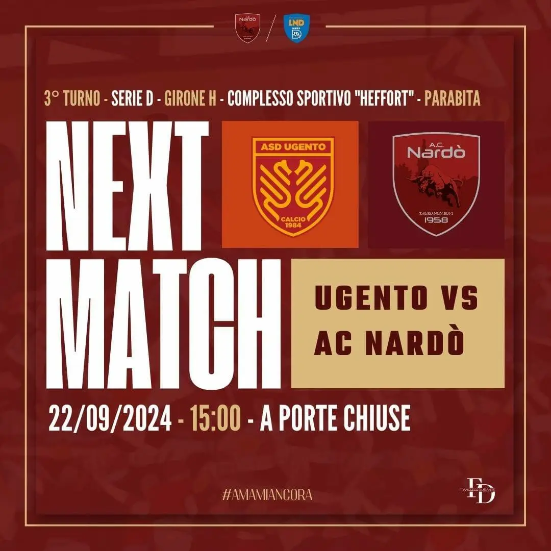 A seguito dell'indisponibilità del campo da parte della società Ugento, si comunica che la gara UGENTO / NARDO' in programma il prossimo 22 settembre alle ore 15:00, sarà disputata al campo “Heffort Sport Village” contrada Monte di Parabita, a porte chiuse.