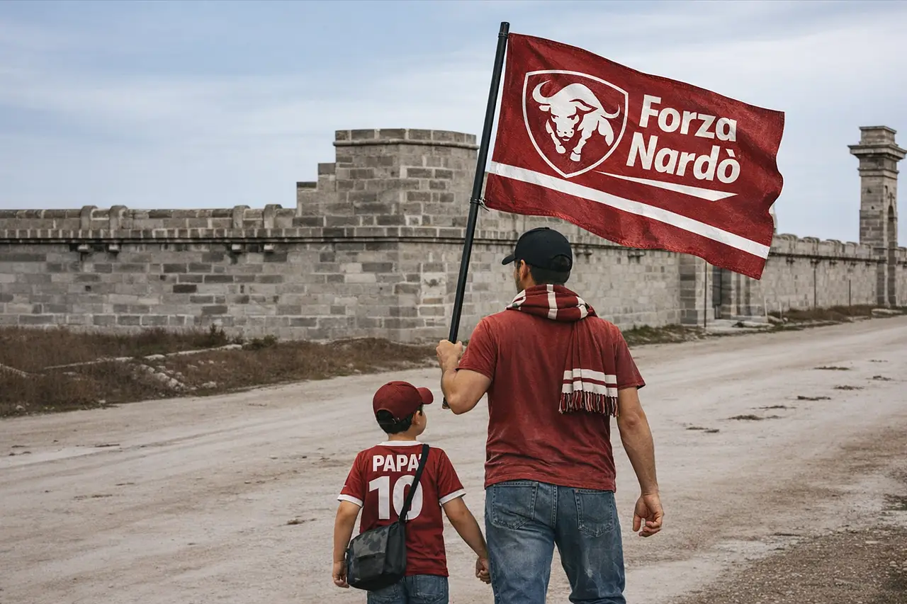 Oggi è una festa speciale. È il giorno in cui celebriamo chi ci ha insegnato a tifare, a credere, a camminare fianco a fianco verso i nostri sogni. Come in questa immagine: un padre e suo figlio, mano nella mano, con la bandiera granata che sventola fiera davanti alle mura della nostra storia. E’ il vissuto di ognuno di noi. Tutti abbiamo percorso questa strada, con l’orgoglio del nostro gigante, del nostro papà che ci accompagna allo stadio a tifare Nardò. Oggi è la loro festa, anche e soprattutto di coloro che non ci sono più, per tutto quello che ci hanno insegnato, compreso l’amore per la nostra maglia. Che non nasce per caso. È un’eredità che scorre nelle vene, tramandataci tra racconti di partite epiche, di trasferte vissute con il cuore, di domeniche che profumano di famiglia e passione.