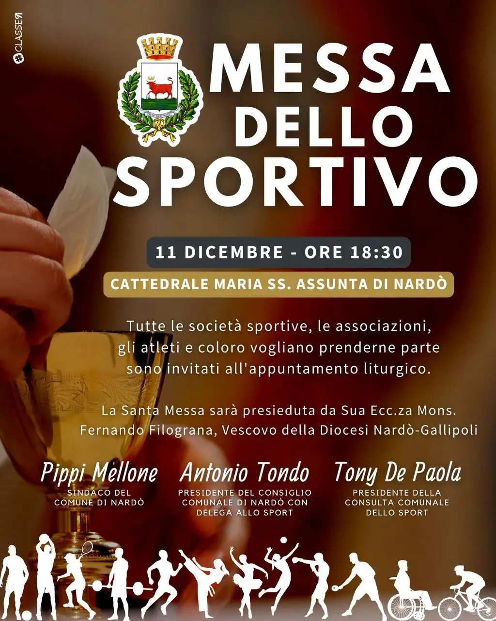 Si rinnova l'appuntamento liturgico della "Messa dello Sportivo". Questa sera presso la Cattedrale Maria SS. Assunta di Nardò, la Santa Messa sarà presieduta da Sua Ecc.za Mons. Fernando Filograna, Vescovo della Diocesì Nardò - Gallipoli. Appuntamento rivolto alle società sportive, alle associazioni, agli atleti e a tutti coloro che vogliano prenderne parte.