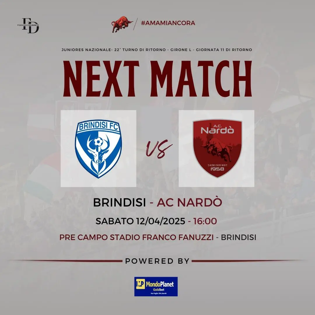 Domani, il pre campo del “Fanuzzi” di Brindisi scalderà i cuori di un'intera città, Nardò, che pulsa all'unisono con i suoi talentuosi giovani. Alle ore 16:00, i "Torelli" di Mister Daniele Marino scenderanno in campo per l'ultimo atto di una stagione che ha saputo regalare emozioni, sudore e una crescita esponenziale. Non è un semplice turno di campionato, è la porta che spalanca le sue ante verso il sogno, verso i tanto agognati play-off del Campionato Nazionale Juniores Under 19.