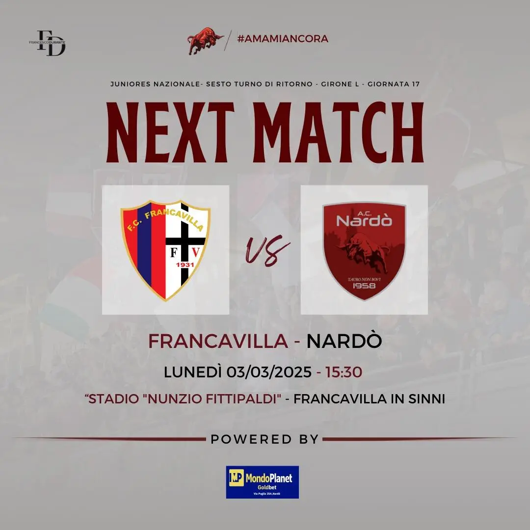 Si completa oggi il quadro del 17° turno della Juniores Nazionale U19, sesta di ritorno, con il match che vedrà impegnati i nostri torelli al “Fittipaldi” di Francavilla in Sinni. Calcio d'inizio alle ore 15:30.